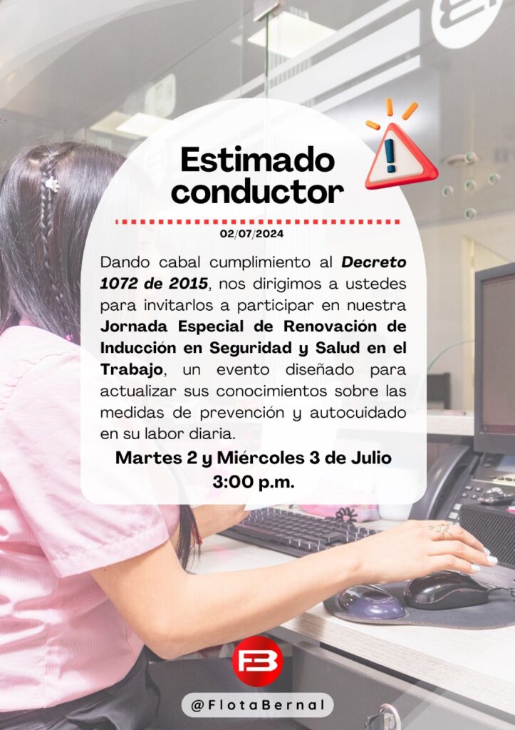 02 Jul Jornada Especial 2 y 3 de Julio Posted at 09:40h in Sin categoría by Claudia Naranjo Share Jornada Especial de Renovación de Inducción en Seguridad y Salud en el Trabajo Estimado Conductor, te invitamos a participar de esta importante actividad.